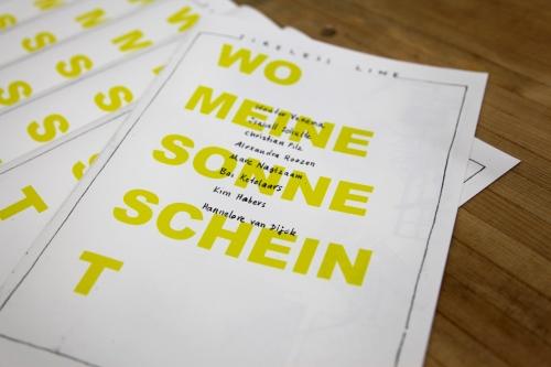 Wo Meine Sonne Scheint is a nomadic artist-run initiative and was founded in 2013 in Rotterdam by Beatrijs Dikker and Bas Ketelaars.
